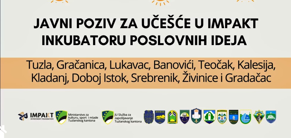 Investicijska fondacija Impakt u partnerstvu sa Ministarstvom za kulturu, sport i mlade Tuzlanskog kantona, JU Službom za zapošljavanje TK i 11 lokalnih zajednica objavljuje javni poziv za mlade od 18 do 35 godina sa područja Tuzlanskog kantona za učešće u programu IMPAKT inkubator poslovnih ideja.